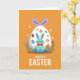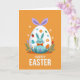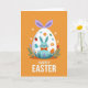 This card features a large white egg centered on a rich orange background, surrounded by leafy green sprigs that curl like they’re gently hugging the scene 🌷. A light blue long-eared bunny peeks from behind the egg with round eyes and a small smile that feels like a friendly hello 🐰. A bright orange bow tie sits neatly at its neck, adding a sweet, dressed-up touch. Across the egg are tiny orange-and-white flowers, a small red berry, and a few mini egg shapes in blue and orange with simple dot and stripe patterns, like little shared notes between friends. Near the top edge, a second pair of soft lavender ears peeks up, hinting at the bunny’s full shape just out of view. At the bottom, “HAPPY EASTER” appears in white uppercase letters, centered and easy to read against the orange. The egg’s surface is filled with scattered blossoms and patterned mini eggs, with green foliage framing the base.