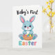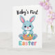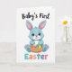 This card shows a plump, stylized rabbit in soft pastel blue sitting at the center of a wide white background 🐰. Its big, shiny eyes and tiny pink nose give it a sweet, friendly look, with light pink inside the ears and a faint blush on the cheeks that reads like affection. The rabbit sits upright with front paws wrapped around a small woven basket, holding it close the way you’d cradle a gift for someone you care about. Inside the basket are decorated eggs in purple, yellow, green, and blue, mixing solid colors with simple stripes and small pattern details. Near the top, a short line of text appears in a thin, flowing style in a darker shade, spaced neatly above the rabbit’s ears. Near the bottom, a second line of text is set in thicker, multicolored letters, stretching across the lower area like a cheerful banner 🌷. The eggs show alternating bands and tiny accents, and the basket weave is drawn with curved lines that suggest texture against the plain white field.