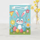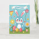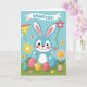 This card features a soft blue, human-like bunny with tall ears lined in pale pink, rosy cheeks, and dark, shining eyes that seem to glance at you with a friendly, affectionate warmth 🐰. The bunny stands on a strip of green grass, posed as if waiting to share a sweet moment with someone close. Around its feet sit several decorated egg shapes, patterned with plaid and gingham in gentle pink, light blue, and buttery yellow. Behind everything is a clear sky in light blue, with simple flowers in red, yellow, and pastel tones rising on thin green stems 🌷. Across the top, a white banner stretches from side to side with the main message printed in a dark color for easy reading. A small pennant on the upper left adds an extra pop of color and a festive touch. The flowers are spaced across the background like little dots of color against the smooth blue sky.
