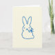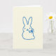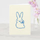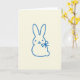 This card features a stylized long-eared bunny centered on a soft, creamy background, outlined in cerulean blue with a lightly grainy, crayon-like texture 🐰. The bunny’s rounded body and tall ears are drawn with simple curves that feel gentle and friendly, like it’s leaning in for a quiet hello. Two tiny dot eyes and a small “3”-shaped mouth give it an innocent look, and the rosy pink cheeks suggest a shy, affectionate blush. A small bow, traced in the same textured blue line, sits along the side as a sweet detail that hints at a thoughtful gift between close friends. Near the top, a short Easter greeting appears in small, neat lettering in matching blue, leaving plenty of open space around the illustration. The roomy layout and limited colors keep the focus on the bunny’s tender expression, with a little spring touch from a 🌷. The cerulean outline stays consistent from ear tips to the bow loops, standing out crisply against the creamy backdrop.