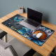 Blue Butterflies on Orange Bloom Desk Mat. This enchanting design features elegant blue butterflies fluttering amidst a stunning array of vibrant flowers. The centrepiece is a large, beautifully detailed flower with lush petals in shades of blue and purple, contrasted by a vivid orange center. The surrounding flora adds depth and richness to the composition, creating a serene and magical scene. Perfect for adding a touch of nature's beauty to your workspace, this design is both calming and visually striking.