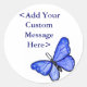 Art painting featuring a blue butterfly with its wings spread in flight. Blue butterfly picture rendered in watercolor. Make customized blue butterflies stickers with your own text and images for great butterfly gifts!