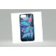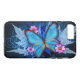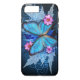 A phone case with a blue butterfly and pink flowers, the butterfly has blue wings with brown edges, and the flowers have pink petals and yellow centers, the background is a dark blue with white leaves and swirls, and there are also some blue splatters and dots.
