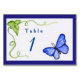 Art features a watercolor of a green vine with a leaf. A picture of a blue butterfly floating by the table number. Words note "Table 1" but can be personalized with your own words and messages. Create your own unique one-of-a-kind table card design by customizing these template garden bugs insects table cards for your wedding, reception, or other personal event information.