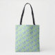 A fresh and charming tote bag featuring a repeating blue butterfly pattern on a soft green background.