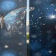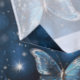 A beautiful seamless repeating pattern of whisical butterflies in blue and faux silver set against a royal blue background that has a scattering of stars and sparkling glitter across it. The butterfly is large and appears to be 3 dimensional. This whimsical style generativecontent design is ideal for nature lovers; restaurants, hotels, resorts and lodges looking for pretty forest insects and animals.