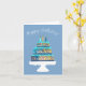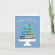 Send stylish birthday wishes with this modern greeting card featuring a beautifully illustrated three-tiered cake on a crisp white cake stand. The cake design showcases rich blues, aquas, and golden tones with artistic detailing, all set against a soft blue background. The white “Happy Birthday!” script adds an elegant finishing touch to the front of the card.