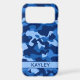Customize this blue camouflage iPhone 17 pro max case with your name in a trendy modern CAP font in dark blue on light blue. It's so modern, girly and trendy! Perfect for any country girl!