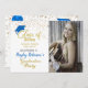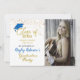 Graduation party invitation in blue and gold school colors. Created with blue cap, blue and white balloons and faux gold glitter, with space for your own photo. All text front and back already formatted and ready for your own text details. Other colors available in this same design. Photo credit: Pixabay image by Lorri Lang