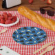 Graduation party paper plates printed with a blue pattern of graduation caps and diplomas with a yellow ribbon.