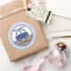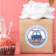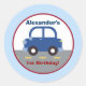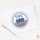 Blue Car transportation theme design. This cute round sticker is customized with your own 2-lines of text.