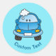 Smiling blue cartoon car with soap bubbles. Custom background color. Custom text.