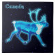 A glowing blue bull caribou, or reindeer, superimposed on a starfield background. Text reading "Canada" also appears in glowing blue and white. The caribou (Rangifer tarandus), known as the reindeer outside of North America, is a deer of the Arctic and Subarctic. While overall widespread and numerous, some subspecies are rare and one has gone extinct. The Inuit word tuktu means - deer that never stops moving. Caribou are always on the move, going north to calve, heading for the winter grounds, and south in the summer. Caribou considerably in colour and size. Uniquely among deer, both genders grow antlers, though these are larger in the males and there are a few populations where females lack them completely. Caribou hunting and herding of semi-domesticated reindeer (for meat, hides, antlers, milk and transportation) are important to several Arctic and Subarctic people. Even far outside its range, the caribou/reindeer is well known due to the myth, probably originating in early 19th century America, in which Santa Claus's sleigh is pulled by flying reindeer, a popular secular element of Christmas. In actual Lapland, reindeer would pull a pulk. Distribution and habitat The caribou/reindeer is a widespread and numerous species in the northern Holarctic, being present in both tundra and taiga (boreal forest). It was originally was found in Scandinavia, eastern Europe, Russia, Mongolia, and northern China north of the 50th latitude. In North America, it was found in Canada, Alaska (USA), and the northern conterminous USA from Washington to Maine. In the 19th century, it was apparently still present in southern Idaho. It also occurred naturally on Sakhalin, Greenland, and probably even in historical times in Ireland. During the late Pleistocene era, reindeer were found as far south as Nevada and Tennessee in North America and Spain in Europe.Today, then species has disappeared from many areas within this large historical range, especially from the southern parts, where it vanished almost everywhere. Large populations are still found in Norway, the Markku region of Finland, Sweden, Siberia, Greenland, Alaska, and Canada. Domesticated reindeer are mostly found in northern Fennoscandia and Russia, with a herd of approximately 150-170 reindeer living around the Cairngorms region in Scotland. The last remaining wild tundra reindeer in Europe are found in portions of southern Norway. A few reindeer from Norway were introduced to the South Atlantic island of South Georgia in the beginning of the 20th century. Today, there are two distinct herds still thriving there, permanently separated by glaciers. Their total numbers are no more than a few thousand. The flag and the coat of arms of the territory contain an image of a reindeer. Around 4000 reindeer have been introduced into the French sub-Antarctic archipelago of Kerguelen Islands. East Iceland has a small herd of about 2500–3000 animals. Caribou and reindeer numbers have fluctuated historically, but many herds are in decline across their range. This global decline is linked to climate change for northern, migratory caribou and reindeer herds and industrial disturbance of caribou habitat for sedentary, non-migratory herds. Fur Fur color varies considerably, both individually, and depending on season and subspecies. Northern populations, which usually are relatively small, are whiter, while southern populations, which typically are relatively large, are darker. This can be seen well in North America, where the northermost subspecies, the Peary Caribou, is the whitest and smallest subspecies of the continent, while the southermost subspecies, the Woodland Caribou, is the darkest and largest. The coat has two layers of fur, a dense woolly undercoat and longer-haired overcoat consisting of hollow, air-filled hairs. Antlers Reindeer antlers grow again each year under a layer of fur called velvet. In most populations both sexes grow antlers, which (in the Scandinavian variety) for old males fall off in December, for young males in the early spring, and for females in the summer. The antlers typically have two separate groups of points, a lower and upper. Domesticated reindeer are shorter-legged and heavier than their wild counterparts. There is considerable subspecific variation in the size of the antlers (e.g., rather small and spindly in the northernmost subspecies), but in some subspecies the bull reindeer's antlers are the second largest of any extant deer, after the moose, and can range up to 39 inches (100 cm) in width and 53 inches (135 cm) in beam length. They have the largest antlers relative to body size among deer.Antler size plays a significant role in establishing group hierarchy. Nose and hooves Reindeer have specialized noses featuring nasal turbinate bones that dramatically increase the surface area within the nostrils. Incoming cold air is warmed by the animal's body heat before entering the lungs, and water is condensed from the expired air and captured before the deer's breath is exhaled, used to moisten dry incoming air and possibly absorbed into the blood through the mucous membranes. Reindeer hooves adapt to the season: in the summer, when the tundra is soft and wet, the footpads become sponge-like and provide extra traction. In the winter, the pads shrink and tighten, exposing the rim of the hoof, which cuts into the ice and crusted snow to keep it from slipping. This also enables them to dig down (an activity known as "cratering") through the snow to their favorite food, a lichen known as reindeer moss. The knees of many species of reindeer are adapted to produce a clicking sound as they walk. Diet Reindeer are ruminants, having a four-chambered stomach. They rely primarily on lichens in winter, especially reindeer moss. However, they also eat the leaves of willows and birches, as well as sedges and grasses. There is some evidence to suggest that on occasion, they will also feed on lemmings, arctic char, and bird eggs. Reindeer 