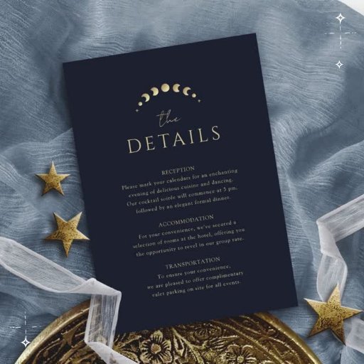 The "Blue Celestial Wedding Envelope" sets the celestial tone from the moment it's received against a mysterious blue backdrop. The crescent moon, stars, and moon phases create a celestial constellation.
