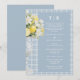 Blue Classic Chalice Vase with Mediterranean Lemons and Flowers Invitation Card Design on a Blue and White Plaid Background.