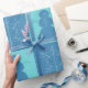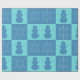 A trendy checkerboard pattern in shades of blue features a simple snowflake and a snowman. Perfect for wrapping those winter holiday gifts.