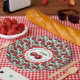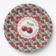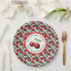A watercolor ai illustration pattern of retro red cherries, sage green foliage and blue checkered plaid personalized birthday paper plates.