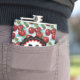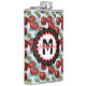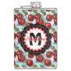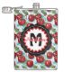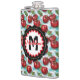 A watercolor ai illustration pattern of retro red cherries, sage green foliage and blue checkered plaid personalized Flask .