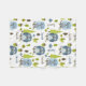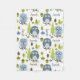 A fleece blanket featuring a pattern with illustrations of blue owls with chevron stomachs, trees, leaves, and acorns. Personalize the name.
