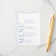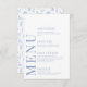 Enhance the charm of your romantic rustic wedding celebration with this sophisticated and polished menu card. Featuring an intricate pattern adorned with delicate light blue flower blooms, this beautiful design is elevated with personalization, showcasing the names of the bride and groom on the reverse side. Perfect for adding an extra touch of allure to your special day.