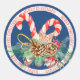 Here's a vintage-styled Christmas sticker with a blue background that spells out Merry Christmas and features candy canes, a gingerbread star, ornament, and pine cones and evergreen branches with holly berries. Fun to display on envelopes, cards, gifts, and more!