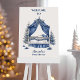 This elegant baby shower design features a beautifully detailed blue canopy crib adorned with festive garlands, set against a backdrop of snow-dusted pine trees and wrapped gifts. The classic navy palette and vintage watercolor style bring a timeless, wintery charm perfect for celebrating a baby boy during the holiday season.