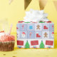 A wrapping paper designed with some Christmas symbols on a square background in blue shades. Merry Christmas!