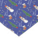 This is a colorful and fun table runner which features a pattern of Holiday images on a bright blue background. The images include a snowman with a hat and striped scarf, a green Holiday tree, a striped Christmas stocking, snowflakes, and the text in white "Merry Christmas!" and "Happy New Year!" Brighten your table for the Holiday season!