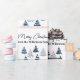 This custom gift wrapping paper features a sophisticated and modern Christmas theme on a white background. A variety of blue and gold colored trees create a mini winter forest. A sample "Merry Christmas" greeting is printed in an elegant script font followed by a sample name. You can personalize the wrapping paper to include your own custom name or other text.