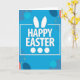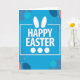 Designed with a modern graphic look, this Easter card features the words “HAPPY EASTER” centered in chunky white letters that appear slightly raised against a bright blue background. Just above the first word, two long white shapes rise like bunny ears 🐰, giving the message a sweet, friendly nod without adding a full character. Beneath the second word, three small white circles sit in a neat row, like little eggs that feel gently gathered together. A thin white rectangular outline frames part of the wording, leaving one side open as if the message is reaching out for a shared moment. Across the blue field, soft translucent circles in teal, deep navy, and a warm coral float around the text, overlapping like quiet conversation between close friends. Tiny golden star-like dots are sprinkled in small clusters, adding a light confetti effect 🌷. The main text stays centered in white while the surrounding shapes are spaced loosely, and the open white outline sits slightly off-center around the lettering. Two ear-like white forms hover above “HAPPY,” and three white circles line up beneath “EASTER” on the glowing blue background.