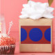 This bold geometric pattern features a blue circle in the center and two blue half circles on the edges of a red background.