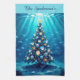 A whimsical underwater ocean scene with a Christmas tree decorated with golden starfish and glowing seashells. Sunlight is filtering through the water from above. Schools of tropical fish are swimming around the tree.