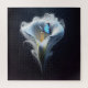 Delicate white lines of a calla lily blossom swirl gracefully around a central orange stamen with a Blue Common Morpho butterfly