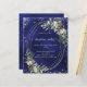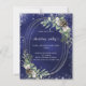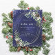 A navy blue, uneven colored background decorated with cones, white berries and greenry. A faux silver oval frame and glitter. Personalize and add the details.