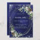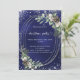 A navy blue, uneven colored background decorated with cones, white berries and greenry. A faux silver oval frame and glitter. Personalize and add the details.