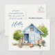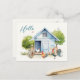 Postcard with chicken coop and optional printed message and address. Large "hello" text on the front is printed in the upper left corner over a cute, blue chicken coop design. Summer green trees poke from behind the chicken's house, with chickens and rooster in the yard.Perfect for keeping in touch with friends, customize with a personal message on the back. Also add a mailing address to the template provided, or delete the sample wording to order blank.