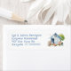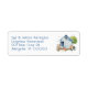Chicken coop return address labels. Cute, light blue coop design with blue, printed text for name and address in three or four lines. Text aligns to the left with design on the right.