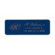 This elegant address label has an intertwined monogram in script font in shades of copper and copper colored text on a navy background.