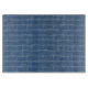 A medium blue color, with a cork texture of randomly placed little black holes, makes up the background of the original artwork by HomeWare on this 11”x8” Cutting Board. Over this background, there are horizontal stripes made up of three thin white lines each. In the center these stripes are wavy, in a rippled pattern that straightens out as it nears the edges.