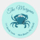 Cute blue crab personalized round return address labels. Customize with your last name and address.