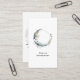 Business card with a mystical illustration. A dark blue crescent moon with a elegant thin circle outline and white flower blossoms along its edges.