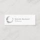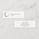 Mini business card with a mystical illustration. A dark blue crescent moon with a elegant thin circle outline and white flower blossoms along its edges.