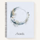 Spiral notebook with a mystical illustration. A dark blue crescent moon with a elegant thin circle outline and white flower blossoms along its edges.