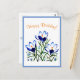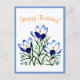 This post card displays an image of three blue crocuses on white background. The original image was painted by W.B. with acrylic paint.