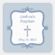 Personalized square Baptism / Christening stickers are a great way to customize your favor, seal your invitations or thank you cards or use for gift labels. This sweet design features a blue cross and your text inside a country blue frame, set on a soft blue background. Coordinating products available.