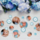 Cute table confetti for a baptism or christening in blue and white, with three of your own photos of you baby boy, and white and blue crosses. Add your baby's initials in a rustic blue font against white.