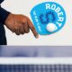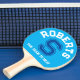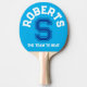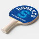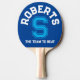 Personalized ping pong paddle with your name and family name initial and team or slogan in white, cyan blue and dark blue, one side has background in cyan sky blue the other in dark blue. Reads Roberts S The team to beat. Personalize this bold sports style paddle bat with your own name and initial and team name or add a slogan. Designed by www.mylittleeden.com on zazzle.