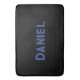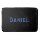Blue custom name on black bath mat