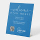 Introducing our custom open house welcome countertop sign, designed specifically for real estate agents. It's more than just a sign—it's a statement piece that reflects your commitment to excellence in real estate. Shown in a classic blue and white palette with a modern script font for "welcome", though all colors are editable. Personalize the template with your event title, information, QR code, and business logo. © Kimbellished, LLC