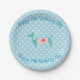 Adorable blue polka dots with soft pastel doxie party plate and customizable name.
